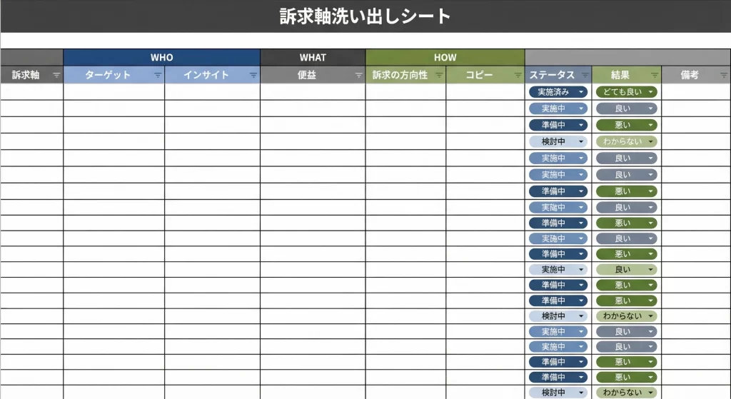 特に助かっているのが、「訴求軸の洗い出しシート」です。